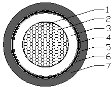 1—軟鋁型線導體;2—導體繞包層;3—絕緣層;4—絕緣繞包層;5—編織屏蔽層;6—屏蔽繞包層;7—護套層